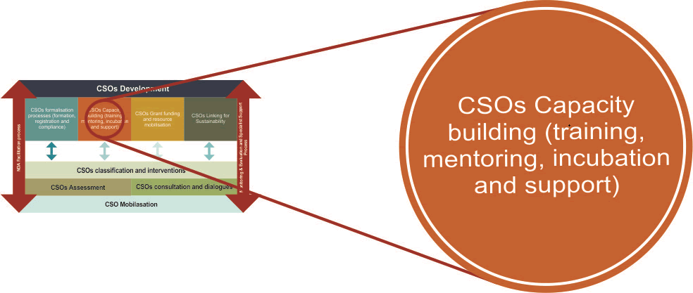 The CSOs’ institutional strengthening intervention is aimed at building and institutionalising organisational capabilities of CSOs to respond to their programmatic needs and compliance to registration requirements and reporting requirements to funders. The programme focuses on strengthening the institutional capacity of CSOs to ensure that their abilities and capabilities to manage their organisations and its programmes efficiently are enhanced. The approach used to build capacities of organisations are: